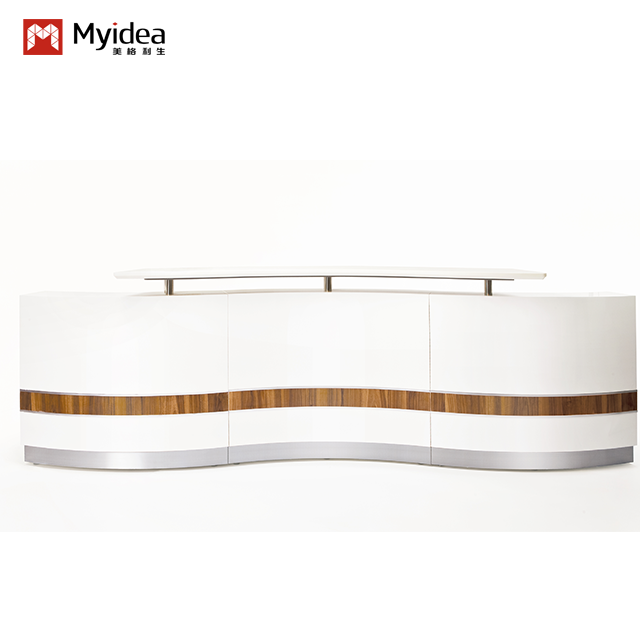 Zakrzywiony, lakierowany piecowo blat recepcyjny, lada barowa dla firmy, szpital urody, klinika stomatologiczna, okrągła lada kasowa, prosty i nowoczesny stół recepcyjny