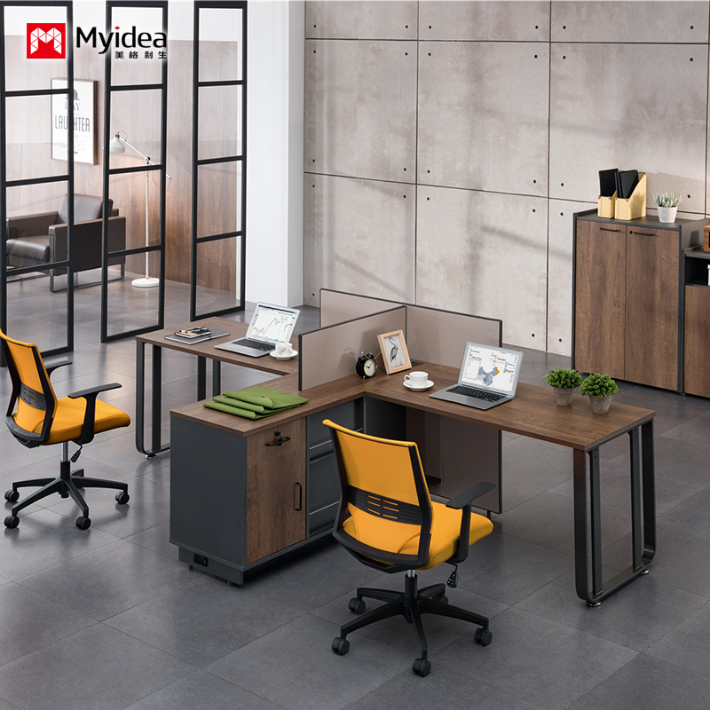 Biuro dla dwóch osób z stalową nogą, szafką boczną do przechowywania, biurko dla pracowników wykonane z materiału melaminowego